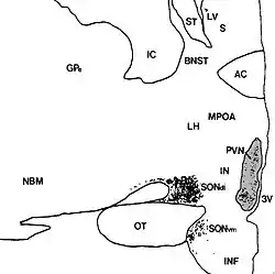![]() Human paraventricular nucleus (PVN) in this coronal section is indicated by the shaded area. Dots represent vasopressin (AVP) neurons (also seen in the supraoptic nucleus, SON). The medial surface is the 3rd ventricle (3V). | |