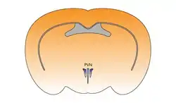 The paraventricular nucleus (PVN, PVA, or PVH) is a nucleus in the hypothalamus. Anatomically, it is adjacent to the third ventricle and many of its neurons project to the posterior pituitary. These projecting neurons secrete oxytocin and a smaller amount of vasopressin, otherwise the nucleus also secretes corticotropin-releasing hormone (CRH) and thyrotropin-releasing hormone (TRH).[1] CRH and TRH are secreted into the hypophyseal portal system and act on different targets neurons in the anterior pituitary. PVN is thought to mediate many diverse functions through these different hormones, including osmoregulation, appetite, and the response of the body to stress.[2]
