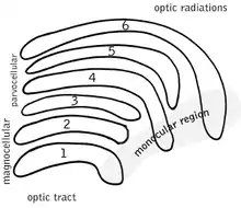 The parvocellular neurons of the visual system receive their input from midget cells, a type of retinal ganglion cell, whose axons are excite the optic tract. These synapses occur in one of the four dorsal parvocellular layers of the lateral geniculate nucleus. The information from each eye is kept separate at this point, and continues to be segregated until processing in the visual cortex. The electrically-encoded visual information leaves the parvocellular cells via relay cells in the optic radiations, traveling to the primary visual cortex layer 4C-β. The parvocellular neurons are sensitive to colour,[1] and are more capable of discriminating fine details than their magnocellular counterparts. Parvocellular cells have greater spatial resolution, but lower temporal resolution, than the magnocellular cells.