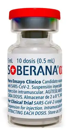 It is a conjugate vaccine that requires two doses, the second one being administered 28 days after the first shot.[4] A third (booster) dose of Soberana Plus may also be given on day 56. It has received emergency use authorization in Iran on June 2021, and in Cuba on August 2021, where it has also been approved for children above 2 years old.[5]
