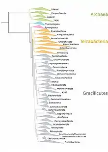 However, several recent studies have suggested that the CPR belongs to Terrabacteria and is more closely related to Chloroflexota.[11][12][13] The evolutionary relationships that are typically supported by these studies are as follows.