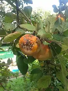 Fungi are another major pathogen type for plants. They can cause a wide variety of issues such as shorter plant height, growths or pits on tree trunks, root or seed rot, and leaf spots.[39] Common and serious plant fungi include the rice blast fungus, Dutch elm disease, chestnut blight and the black knot and brown rot diseases of cherries, plums, and peaches. It is estimated that pathogenic fungi alone cause up to a 65% reduction in crop yield.[38]