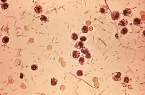 Fungi are eukaryotic organisms that can function as pathogens. There are approximately 300 known fungi that are pathogenic to humans, including Candida albicans, which is the most common cause of thrush, and Cryptococcus neoformans, which can cause a severe form of meningitis.[19] Typical fungal spores are 4.7 μm long or smaller.[20]