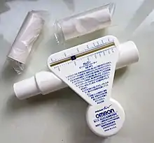 The peak expiratory flow (PEF), also called peak expiratory flow rate (PEFR) and peak flow measurement,[1] is a person's maximum speed of expiration, as measured with a peak flow meter, a small, hand-held device used to monitor a person's ability to breathe out air. It measures the airflow through the bronchi and thus the degree of obstruction in the airways. Peak expiratory flow is typically measured in units of liters per minute (L/min).