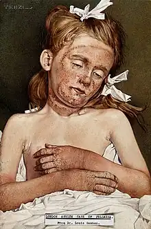Pellagra was first described for its dermatological effect in Spain in 1735 by Gaspar Casal. He explained that the disease causes dermatitis in exposed skin areas such as hands, feet and neck and that the origin of the disease is poor diet and atmospheric influences.[23] His work published in 1762 by his friend Juan Sevillano was titled Historia Natural y Medicina del Principado de Asturias or Natural and Medical History of the Principality of Asturias (1762). This led to the disease being known as "Asturian leprosy", and it is recognized as the first modern pathological description of a syndrome.[24] It was an endemic disease in northern Italy, where it was named, from Lombard, as "pell agra" (agra = holly-like or serum-like; pell = skin)[25] by Francesco Frapolli of Milan.[26] With pellagra affecting over 100,000 people in Italy by the 1880s, debates raged as to how to classify the disease (as a form of scurvy, elephantiasis or as something new), and over its causation. In the 19th century, Roussel started a campaign in France to restrict consumption of maize and eradicated the disease in France, but it remained endemic in many rural areas of Europe.[27] Because pellagra outbreaks occurred in regions where maize was a dominant food crop, the most convincing hypothesis during the late 19th century, as espoused by Cesare Lombroso, was that the maize either carried a toxic substance or was a carrier of disease.[28] Louis Sambon, an Anglo-Italian doctor working at the London School of Tropical Medicine, was convinced that pellagra was carried by an insect, along the lines of malaria. Later, the lack of pellagra outbreaks in Mesoamerica, where maize is a major food crop, led researchers to investigate processing techniques in that region.