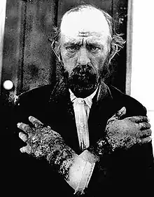 Goldberger experimented on 11 prisoners (one was dismissed because of prostatitis). Before the experiment, the prisoners were eating the prison fare fed to all inmates at Rankin Prison Farm in Mississippi.[34] Goldberger started feeding them a restricted diet of grits, syrup, mush, biscuits, cabbage, sweet potatoes, rice, collards, and coffee with sugar (no milk). Healthy white male volunteers were selected as the typical skin lesions were easier to see in Caucasians and this population was felt to be those least susceptible to the disease, and thus provide the strongest evidence that the disease was caused by a nutritional deficiency. Subjects experienced mild, but typical cognitive and gastrointestinal symptoms, and within five months of this cereal-based diet, 6 of the 11 subjects broke out in the skin lesions that are necessary for a definitive diagnosis of pellagra. The lesions appeared first on the scrotum.[35] Goldberger was not given the opportunity to experimentally reverse the effects of diet-induced pellagra as the prisoners were released shortly after the diagnoses of pellagra were confirmed.[34] In the 1920s, he connected pellagra to the corn-based diets of rural areas rather than infection as contemporary medical opinion would suggest.[36][37] Goldberger believed that the root cause of pellagra amongst Southern farmers was limited diet resulting from poverty, and that social and land reform would cure epidemic pellagra. His reform efforts were not realized, but crop diversification in the Southern United States, and the accompanying improvement in diet, dramatically reduced the risk of pellagra.[38] Goldberger is remembered as the "unsung hero of American clinical epidemiology".[39] Though he identified that a missing nutritional element was responsible for pellagra, he did not discover the specific vitamin responsible.