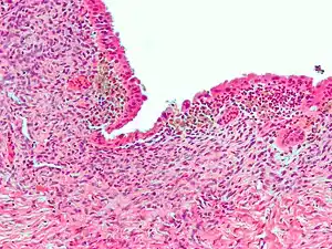 | Micrograph showing endometriosis (H&E stain), a common cause of chronic pelvic pain in women. | |