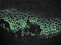 Pemphigus defines a group of autoimmune intraepithelial blistering diseases that are characterized by loss of normal cell-cell adhesion (acantholysis), and by the presence of pathogenic (predominantly IgG) autoantibodies reacting against epithelial adhesion molecules.[13] Pemphigus is further divided in two major subtypes: pemphigus vulgaris (PV) and pemphigus foliaceus (PF). However, several other disorders such as IgA pemphigus, IgE pemphigus, pemphigus herpetiformis, drug-induced pemphigus, Senear Usher syndrome, and endemic pemphigus foliaceus exist, and are recognized by a dermatologist from the appearance and distribution of the skin lesions. It is also commonly diagnosed by specialists practicing otolaryngology- head and neck surgery, periodontists, oral and maxillofacial surgeons, and eye doctors, as lesions can affect the eyes and mucous membranes of the oral cavity. Intraorally, it resembles the more common diseases lichen planus and mucous membrane pemphigoid.[14] Definitive diagnosis requires examination of a skin or mucous membrane biopsy by a dermatopathologist or oral pathologist. The skin biopsy is taken from the edge of a blister, prepared for histopathology and examined with a microscope. The pathologist looks for an intraepidermal vesicle caused by the breaking apart of epidermal cells (acantholysis). Thus, the superficial (upper) portion of the epidermis sloughs off, leaving the bottom layer of cells on the "floor" of the blister. This bottom layer of cells is said to have a "tombstone" appearance.