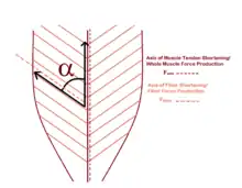 A pennate or pinnate muscle (also called a penniform muscle) is a type of skeletal muscle with fascicles that attach obliquely (in a slanting position) to its tendon. This type of muscle generally allows higher force production but a smaller range of motion.[1] [2] When a muscle contracts and shortens, the pennation angle increases.[3]