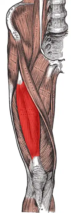 ![]() Muscles of the iliac and anterior femoral regions. (Rectus femoris highlighted in red.) | |
