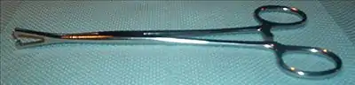 A Pennington clamp, also known as a Duval clamp, is a surgical clamp with a triangular eyelet.[1] Used for grasping tissue, particularly during intestinal and rectal operations. Also used in some OB/GYN procedures, particularly caesarian section. Under the name 'Duval clamp' they are occasionally used much like a Foerster clamp to atraumatically grasp lung tissue. The clamp is named after David Geoffrey Pennington, an Australian surgeon who is a pioneer of microsurgeries.