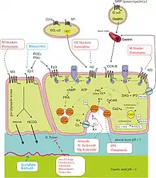 Taking nonsteroidal anti-inflammatory drugs (NSAIDs) such as aspirin[22] can increase the risk of peptic ulcer disease by four times compared to non-users. The risk of getting a peptic ulcer is two times for aspirin users. Risk of bleeding increases if NSAIDs are combined with selective serotonin reuptake inhibitor (SSRI), corticosteroids, antimineralocorticoids, and anticoagulants. The gastric mucosa protects itself from gastric acid with a layer of mucus, the secretion of which is stimulated by certain prostaglandins. NSAIDs block the function of cyclooxygenase 1 (COX-1), which is essential for the production of these prostaglandins. Besides this, NSAIDs also inhibit stomach mucosa cells proliferation and mucosal blood flow, reducing bicarbonate and mucus secretion, which reduces the integrity of the mucosa. Another type of NSAIDs, called COX-2 selective anti-inflammatory drugs (such as celecoxib), preferentially inhibit COX-2, which is less essential in the gastric mucosa. This reduces the probability of getting peptic ulcers; however, it can still delay ulcer healing for those who already have a peptic ulcer.[14] Peptic ulcers caused by NSAIDs differ from those caused by H. pylori as the latter's appear as a consequence of inflammation of the mucosa (presence of neutrophil and submucosal edema), the former instead as a consequence of a direct damage of the NSAID molecule against COX enzymes, altering the hydrophobic state of the mucus, the permeability of the lining epithelium and mitochondrial machinery of the cell itself. In this way NSAID's ulcers tend to complicate faster and dig deeper in the tissue causing more complications, often asymptomatically until a great portion of the tissue is involved.