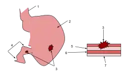 Other causes of peptic ulcer disease include gastric ischaemia, drugs, metabolic disturbances, cytomegalovirus (CMV), upper abdominal radiotherapy, Crohn's disease, and vasculitis.[14] Gastrinomas (Zollinger–Ellison syndrome), or rare gastrin-secreting tumors, also cause multiple and difficult-to-heal ulcers.[30]