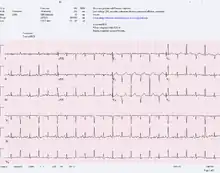 ECG: may present with sinus tachycardia, low voltage QRS as well as electrical alternans.[2] Due to the fluid accumulation around the heart, the heart is further away from the chest leads, which leads to the low voltage QRS. Electrical alternans signifies the up-and-down change of the QRS amplitude with every beat due to the heart swinging in the fluid (as displayed in the ultrasound image in the introduction) .[1] These three findings together should raise suspicion for impending hemodynamic instability associated with cardiac tamponade.