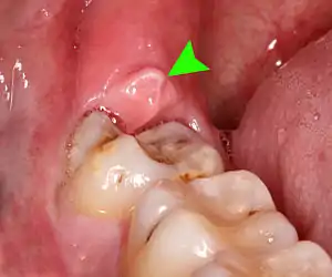 | Pericoronitis associated with the lower right third molar (wisdom tooth). | |