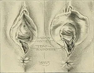 - Third-degree tear: fourchette, perineal skin, vaginal mucosa, muscles, and anal sphincter are torn; third-degree tears may be further subdivided into three subcategories:[6]