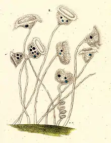 The larger order of Peritrichia are the Sessilida. Most of these have modified posterior kinetosomes which secrete a contractile stalk. The unattached stage, called a telotroch, is mouthless. These are common in both freshwater and marine environments, and many live attached to aquatic plants and animals. They are either solitary or produce branched colonies. A few secrete a lorica. Vorticella is one of the best-known genera. Stalks may be as long as 2 mm, and in some cases where they are highly contractile can be extended up to 3 mm.