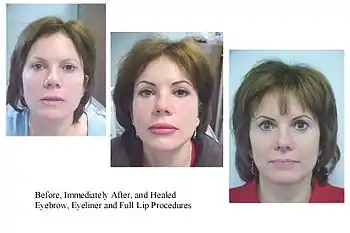 Permanent makeup, also known as permanent cosmetics, derma-pigmentation, micro-pigmentation, and cosmetic tattooing,[1] is a cosmetic technique which employs tattoos (permanent pigmentation of the dermis) as a means of producing designs that resemble makeup, such as eye-lining and other permanent enhancing colors to the skin of the face, lips, and eyelids. It is also used to produce artificial eyebrows, particularly in people who have lost them as a consequence of old age, disease, such as alopecia totalis, chemotherapy, or a genetic disturbance, and to disguise scars and hypopigmentation in the skin such as in vitiligo.[2] It is also used to restore or enhance the breast's areola, such as after breast surgery.