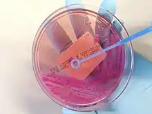 A Petri dish (alternatively known as a Petri plate or cell-culture dish) is a shallow transparent lidded dish that biologists use to hold growth medium in which cells can be cultured,[1][2] originally, cells of bacteria, fungi and small mosses.[3] The container is named after its inventor, German bacteriologist Julius Richard Petri.[4][5][6] It is the most common type of culture plate. The Petri dish is one of the most common items in biology laboratories and has entered popular culture. The term is sometimes written in lower case, especially in non-technical literature.[7][8]