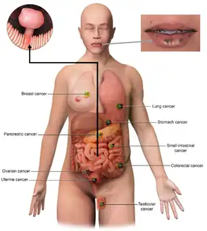 Peutz–Jeghers syndrome (often abbreviated PJS) is an autosomal dominant genetic disorder characterized by the development of benign hamartomatous polyps in the gastrointestinal tract and hyperpigmented macules on the lips and oral mucosa (melanosis).[2] This syndrome can be classed as one of various hereditary intestinal polyposis syndromes[3] and one of various hamartomatous polyposis syndromes.[4] It has an incidence of approximately 1 in 25,000 to 300,000 births.[5]