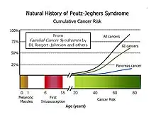 Most patients will develop flat, brownish spots (melanotic macules) on the skin, especially on the lips and oral mucosa, during the first year of life, and a patient's first bowel obstruction due to intussusception usually occurs between the ages of six and 18 years. The cumulative lifetime cancer risk begins to rise in middle age. Cumulative risks by age 70 for all cancers, gastrointestinal (GI) cancers, and pancreatic cancer are 85%, 57%, and 11%, respectively.[13]