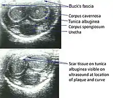 On penile ultrasonography, the typical appearance is hyperechoic focal thickening of the tunica albuginea. Due to associated calcifications, the imaging of patients with Peyronie's disease shows acoustic shadowing, as illustrated in figures below. Less common findings, attributed to earlier stages of the disease (still mild fibrosis), are hypoechoic lesions with focal thickening of the paracavernous tissues, echoic focal thickening of the tunica without posterior acoustic shadowing, retractile isoechoic lesions with posterior attenuation of the beam, and focal loss of the continuity of the tunica albuginea. In the Doppler study, increased flow around the plaques can suggest inflammatory activity and the absence of flow can suggest disease stability. Ultrasound is useful for the identification of lesions and to determine their relationship with the neurovascular bundle. Individuals with Peyronie's disease can present with erectile dysfunction, often related to venous leakage, due to insufficient drainage at the site of the plaque. Although plaques are more common on the dorsum of the penis, they can also be seen on the ventral face, lateral face, or septum.[13]