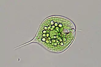 The pellicles forms a shell around the cytoskeleton covering the whole cell and fuses together around the microtubule reinforced-pocket (MTR).[10] This pocket acts as a sort of cytostome or ingestion organelle, allowing the organism to feed when bacteria enter inside. The microtubules are arranged in a peculiar doublet and triplet pattern in the upper canal. In certain species of Phacus, the MTR is a microtubule organizing center and is connected to a reservoir membrane by a striated fiber.[10] Many species also possess an elongated caudal process with extended pellicle strips. Throughout the cytoplasm of the cell, chloroplasts are spread out fairly evenly and in high numbers. They are typically discoid and are regularly disposed of and replaced.[7] Chloroplasts that are present in large numbers are typically smaller, are without pyrenoids and species containing fewer chloroplasts tend to have much larger ones. Phacus, like all photosynthetic euglenoids, obtained their plastids through secondary endosymbiosis, where the ancestral phagocytic euglenoid engulfed a green alga, and the resulting organism became the plastid.[12]