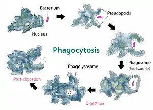 - Underhill DM, Ozinsky A (April 2002). "Phagocytosis of microbes: complexity in action". Annual Review of Immunology. 20 (1): 825–52. doi:10.1146/annurev.immunol.20.103001.114744. PMID 11861619.
