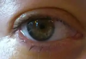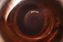 ![]() Photo of an eye after PIOL-implantation, 24 hours after surgery. The lens is visible in front of the iris; the pupil is still small due to presurgery eyedrops. |