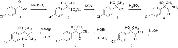p-Chloroacetophenone and NaCN are reacted together to give the corresponding cyanohydrin (cf Strecker synthesis), CID:12439573. The cyano group is then hydrated in acid to the corresponding amide, p-chloroatrolactamide, CID:15255544 (4). The amide group is then further hydrolyzed with a 2nd equivalent of water in concentrated lye to p-chloroatrolactic acid, [4445-13-0] (5). Esterification to Ethyl p-chloroatrolactate [100126-96-3](6). Finally, nucleophilic addition a couple of equivalents of MeMgI are added to the ester give Phenaglycodol (7) crystals.