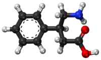 Phenibut is a derivative of the inhibitory neurotransmitter GABA.[6] Hence, it is a GABA analogue.[6] Phenibut is specifically the analogue of GABA with a phenyl ring substituted in at the β-position.[6] As such, its chemical name is β-phenyl-γ-aminobutyric acid, which can be abbreviated as β-phenyl-GABA.[6] The presence of the phenyl ring allows phenibut to cross the blood–brain barrier significantly, unlike the case of GABA.[6] Phenibut also contains the trace amine β-phenethylamine in its structure.[6]
