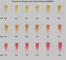 A solution of phenol red is used as a pH indicator, often in cell culture. Its color exhibits a gradual transition from yellow (λmax = 443 nm[2]) to red (λmax = 570 nm[3]) over the pH range 6.8 to 8.2. Above pH 8.2, phenol red turns a bright pink (fuchsia) color.[4][5]