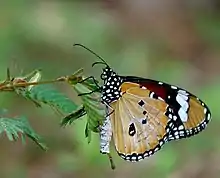 Many well-studied insect species, such as the ant Leptothorax acervorum, the moths Helicoverpa zea and Agrotis ipsilon, the bee Xylocopa sonorina, the frog Pseudophryne bibronii, and the butterfly Edith's checkerspot release sex pheromones to attract a mate, and some lepidopterans (moths and butterflies) can detect a potential mate from as far away as 10 km (6.2 mi).[21][22] Some insects, such as ghost moths, use pheromones during lek mating.[23] Traps containing pheromones are used by farmers to detect and monitor insect populations in orchards. In addition, Colias eurytheme butterflies release pheromones, an olfactory cue important for mate selection.[24]