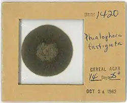 Phialophora fastigiata was originally described in 1928 as Cadophora fastigiata by Lagerberg and Melin, who erected the genus Cadophora to accommodate C. fastigiata.[5] In 1937, Conant compared eight species of Cadophora with Phialophora verrucosa and determined that they belonged to the same genus. As such, seven species of Cadophora, including C. fastigiata were transferred to the genus Phialophora.[5] Although later examination of the internal transcribed spacers of ribosomal DNA (rDNA) genes in Cadophora melinii and P. fastigiata showed morphological similarity, the colony morphology of the two species is distinctive.[7]