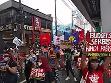 On April 1, 2020, around 150 protesters called on the local government for food aid amid the enhance community quarantine in Luzon.[118] Local police dispersed protesters assembled along E. Delos Santos Avenue in Barangay Bagong Pag-asa, Quezon City, arresting 20 in the process for staging a rally without a permit.[119][120] The NBI probed the incident, though it did not say what violations the organizers might face.[118] The arrests were condemned by urban poor group Kalipunan ng Damayang Mahihirap (Kadamay) chair Bea Arellano.[119]