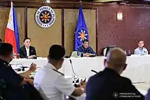 Both the Armed Forces of the Philippines (AFP) and the Philippine National Police (PNP) have been deployed by the national government as front liners in addressing the pandemic.[66] PNP Chief Archie Gamboa tasked his agency to increase their visibility in various communities and to arrest individuals and groups "without warning" involved in activities that violate quarantine protocols on physical distancing and mass gatherings.[67] Border checkpoints maintained by the AFP, PNP, and the Philippine Coast Guard were installed in areas with community quarantine to control the traffic of people and goods and ultimately contain the spread of the virus across regions during the pandemic.[68]