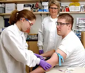 Phlebotomies are carried out by phlebotomists – people trained to draw blood mostly from veins for clinical or medical testing, transfusions, donations, or research. Blood is collected primarily by performing venipunctures, or by using capillary blood sampling with[4] fingersticks or a heel stick in infants for the collection of minute quantities of blood.[5] The duties of a phlebotomist may include interpreting the tests requested, drawing blood into the correct tubes with the proper additives, accurately explaining the procedure to the person and preparing them accordingly, practicing the required forms of asepsis, practicing standard and universal precautions, restoring hemostasis of the puncture site, giving instructions on post-puncture care, affixing tubes with electronically printed labels, and delivering specimens to a laboratory.[6] Some countries, states, or districts require that phlebotomists be licensed or registered.