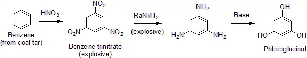 A modern synthesis of phloroglucinol involves hydrolysis of benzene-1,3,5-triamine and its derivatives.[3] Representative is the following route from trinitrobenzene.[4]