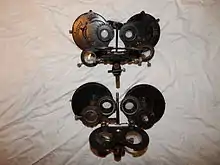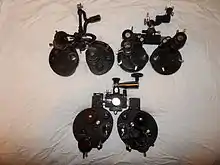 There were no cylindrical lenses, so testing for astigmatism required the use of manual trial-lenses, for which there were rotating holders on the front of each eye hole, and there were stationary ones on the backs as well. Cross-cylinders were optional, but they did not flip like a Jackson cross cylinder, they rotated in the same plane, so they were probably meant for the near point cross-cylinder test for reading.[7] It weighed 3 lb. 2 oz. Around 1920 an improved model, No. 574, was introduced, reduced in size but with the same range (lenses reduced from 1 inch to 3⁄4 inch). The forehead rest was removed, and the rear trial lens clips were replaced with rubber eye guards. It weighed 2 lbs. 12 oz.