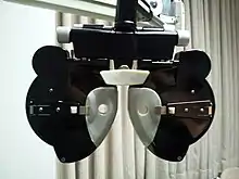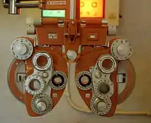 A phoropter or refractor is an ophthalmic testing device. It is commonly used by eye care professionals during an eye examination, and contains different lenses used for refraction of the eye during sight testing, to measure an individual's refractive error and determine their eyeglass prescription. [1] It also is used to measure the patients' phorias and ductions, which are characteristics of binocularity.