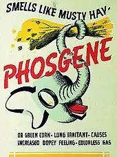 Phosgene was first deployed as a chemical weapon by the French in 1915 in World War I.[23] It was also used in a mixture with an equal volume of chlorine, with the chlorine helping to spread the denser phosgene.[24][25] Phosgene was more potent than chlorine, though some symptoms took 24 hours or more to manifest.