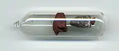 Red phosphorus is polymeric in structure. It can be viewed as a derivative of P4 wherein one P-P bond is broken, and one additional bond is formed with the neighbouring tetrahedron resulting in chains of P21 molecules linked by van der Waals forces.[18] Red phosphorus may be formed by heating white phosphorus to 250 °C (482 °F) or by exposing white phosphorus to sunlight.[19] Phosphorus after this treatment is amorphous. Upon further heating, this material crystallises. In this sense, red phosphorus is not an allotrope, but rather an intermediate phase between the white and violet phosphorus, and most of its properties have a range of values. For example, freshly prepared, bright red phosphorus is highly reactive and ignites at about 300 °C (572 °F),[20] though it is more stable than white phosphorus, which ignites at about 30 °C (86 °F).[21] After prolonged heating or storage, the color darkens (see infobox images); the resulting product is more stable and does not spontaneously ignite in air.[22]