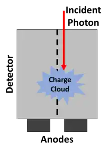Partial energy deposition and single photons causing signals in multiple pixels poses another challenge in photon-counting CT.[2] Charge sharing, where an interaction takes place close to a pixel boundary, causing the released energy to be shared between neighboring pixels and thus be interpreted as several lower-energy photons, is one cause of such events (see figure to the right). Others include the emission of K-escape X-rays and Compton scattering, where the escaping or scattered photon results in a partial energy deposition in the primary pixel and may go on to cause further interactions in different pixels. The effects mentioned take place also in EIDs but cause additional problems in PCDs since they result in a distorted energy spectrum. In contrast to saturation and pileup effects, problems caused by partial energy deposition and multiply interacting photons is aggravated by smaller pixel size. Anti-coincidence logic, where simultaneous events in nearby pixels are added, can be used to somewhat counteract counting the same photon in different pixels.