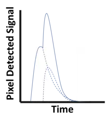 To avoid saturation in areas where little material is present between the X-ray source and the detector, the pulse resolving time must be small compared to the average time between photon interactions in a pixel. Even before saturation, the detector functionality starts to deteriorate because of pulse pileup (see figure to the left), where two (or more) photon interactions take place in the same pixel too close in time to be resolved as discrete events. Such quasi-coincident interactions lead to a loss of photon counts and distorts the pulse shape, skewing the recorded energy spectrum.[2] Due to these effects, the demands on the physical response time of the detector material as well as on the electronics responsible for pulse-shaping, binning and recording pixel data become very high. Using smaller image pixels decreases the per-pixel count rate and thus alleviates the demands on pulse resolving time at the expense of requiring more electronics.