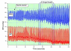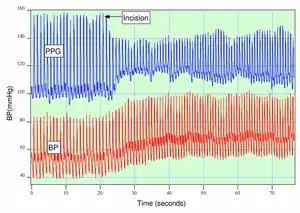 Anesthesiologists must often judge subjectively whether a patient is sufficiently anesthetized for surgery. As seen in the figure, if a patient is not sufficiently anesthetized, the sympathetic nervous system response to an incision can generate an immediate response in the amplitude of the PPG.[13]