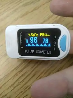 The change in volume caused by the pressure pulse is detected by illuminating the skin with the light from a light-emitting diode (LED) and then measuring the amount of light either transmitted or reflected to a photodiode.[4] Each cardiac cycle appears as a peak, as seen in the figure. Because blood flow to the skin can be modulated by multiple other physiological systems, the PPG can also be used to monitor breathing, hypovolemia, and other circulatory conditions.[5] Additionally, the shape of the PPG waveform differs from subject to subject, and varies with the location and manner in which the pulse oximeter is attached.