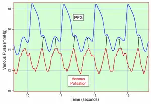 A photoplethysmogram (PPG) is an optically obtained plethysmogram that can be used to detect blood volume changes in the microvascular bed of tissue.[1][2] A PPG is often obtained by using a pulse oximeter which illuminates the skin and measures changes in light absorption.[3] A conventional pulse oximeter monitors the perfusion of blood to the dermis and subcutaneous tissue of the skin.