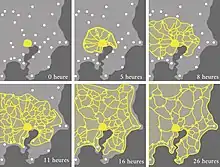 When presented with more than two food sources, P. polycephalum apparently solves a more complicated transportation problem. With more than two sources, the amoeba also produces efficient networks.[16] In a 2010 paper, oatflakes were dispersed to represent Tokyo and 36 surrounding towns.[17][18] P. polycephalum created a network similar to the existing train system, and "with comparable efficiency, fault tolerance, and cost". Similar results have been shown based on road networks in the United Kingdom[19] and the Iberian peninsula (i.e., Spain and Portugal).[20] P. polycephalum not only can solve these computational problems but also exhibits some form of memory. By repeatedly making the test environment of a specimen of P. polycephalum cold and dry for 60 minute intervals, Hokkaido University biophysicists discovered that the slime mold appears to anticipate the pattern by reacting to the conditions when they did not repeat the conditions for the next interval. Upon repeating the conditions, it would react to expect the 60 minute intervals, as well as testing with 30 and 90 minute intervals.[21][22]