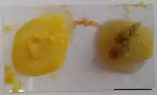 In laboratory strains carrying a mutation at the matA mating-type locus, the differentiation of P. polycephalum plasmodia can occur without the fusion of amoebae, resulting in haploid plasmodia that are morphologically indistinguishable from the more typical diploid form.[6] This enables easier genetic analysis of plasmodial traits that would otherwise require backcrossing to achieve homozygosity for analysis of recessive mutations in diploids. Sporangia from haploid plasmodia generate spores with low fertility, and it is assumed that viable spores develop from meiosis of rare diploid nuclei in the otherwise haploid P. polycephalum plasmodia. Apogamic development can also occur in nature in various species of myxomycetes.[7] In the figure of the P. polycephalum life cycle, the typical haploid-diploid sexual cycle is depicted in the outer circuit and the apogamic cycle in the inner circuit. Note that an apogamic amoeba retains its matA1 mating type specificity and can still fuse sexually with an amoeba of a different mating type to form a diploid heterozygous plasmodium—another characteristic that facilitates genetic analysis.