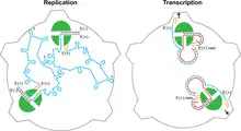 Picobirnavirus RdRp replication (L) and transcription (R) in the viral capsid.